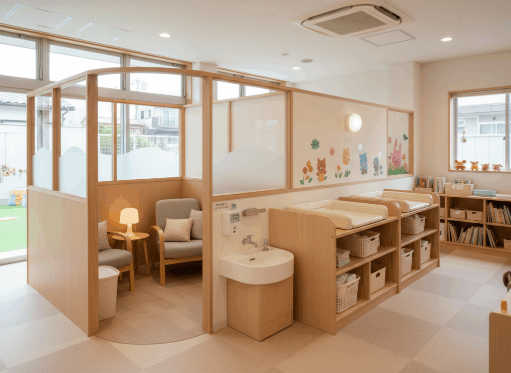 小さなお子さまが快適に過ごせるよう、授乳室やおむつ替えスペースを清潔に整備。保護者の方にも安心して預けていただける環境です。